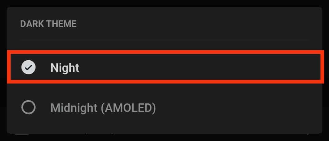 - A small menu with “Night” and “Midnight (AMOLED)” options will appear. Pick your preferred theme.
