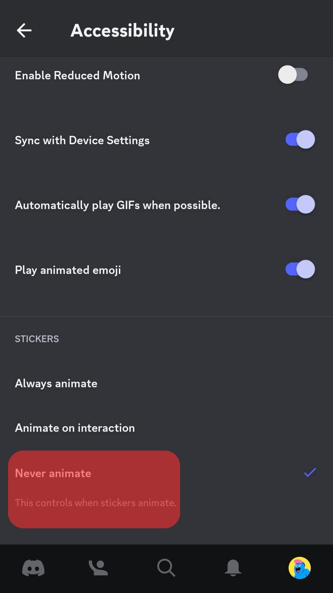 - Under “Stickers”, enable the option for “Never animate”.