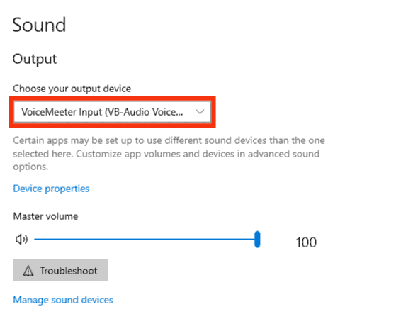 - Pick VB-Audio Voicemeter (VAIO) as your output device.