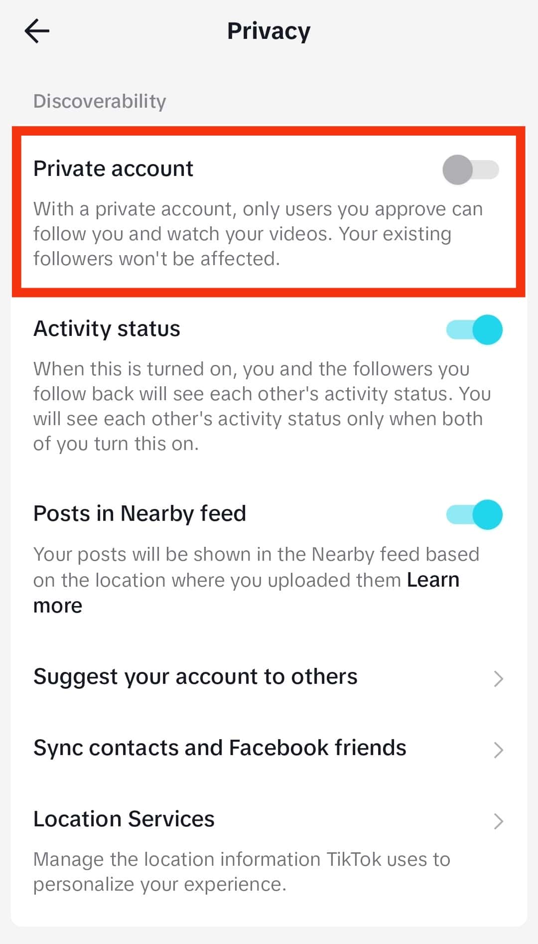 - In the next window, you’ll see the “Private Account” option under the discoverability menu.